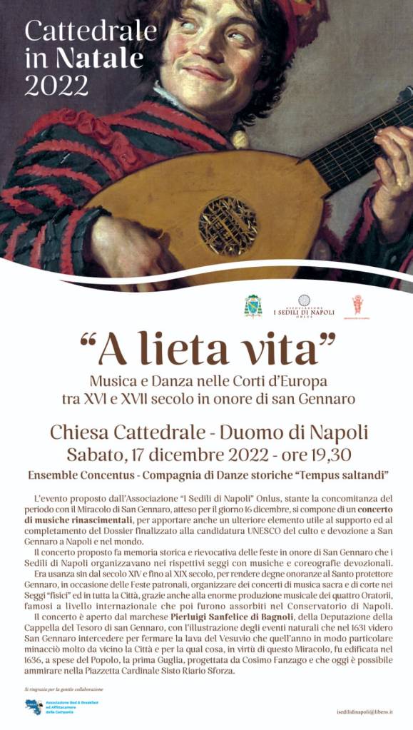 A Napoli, fino al 1800, era consuetudine, soprattutto nelle feste e nelle onoranze patronali, trasformare gli antichi edifici dei “Sedili” in veri e propri piccoli teatri cortesi che ospitavano i maggiori musicisti dell’epoca per accompagnare le danze delle giovani Dame di Tocco delle rispettive famiglie patrizie ascritte ai Sedili ma anche il Popolo organizzava nelle piazze principali analoghi eventi musicali ed artistici. Con il concerto “A Lieta Vita” offerto gratuitamente alla cittadinanza ed ai turisti in Cattedrale, si farà pertanto memoria storica e rievocazione del sentimento cittadino di Fede e Devozione nei confronti di San Gennaro, in occasione dell’auspicato prodigio della liquefazione del sangue che dal 1631 si rinnova quasi ogni anno il 16 dicembre. Fu in quell’anno, infatti che a seguito di una violentissima eruzione del Vesuvio che causò la morte di circa 4.000 persone e che seminò la distruzione nei paesi vesuviani che si affacciano sul Golfo, la preziosa reliquia, portata in solenne processione fino al Ponte della Maddalena, al cospetto del vulcano, improvvisamente si sciolse con il repentino spegnimento della terribile eruzione. Come ex-voto i Napoletani raccolsero somme necessarie per commissionare a Cosimo Fanzago la bellissima guglia che campeggia davanti alla scalinata monumentale della Cattedrale in Piazzetta Sisto Riario Sforza ed in quella piazzetta, fino al XIX secolo, si tenevano le feste cittadine in ricordo dell’evento miracoloso per onorare San Gennaro.