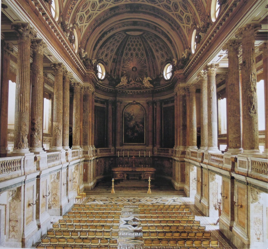 Per un suo nuovo, ampio e generale inquadramento storico-filologico della Cappella Palatina nella Reggia di Caserta, lo storico dell’arte Salvatore Costanzo, esperto delle opere del Vanvitelli e autore di numerose pubblicazioni sull’artista, rileva oggi la presenza di un prezioso disegno (in collezione privata eredi De Peruta), raffigurante lo spaccato della Real Cappella borbonica (1). Secondo il parere dello studioso, la composizione sarebbe stata eseguita da Luigi Vanvitelli a partire dal 1757 – circa un anno dopo l’inizio della costruzione – all’indomani della celebre “Dichiarazione dei disegni del Reale Palazzo di Caserta” (2).