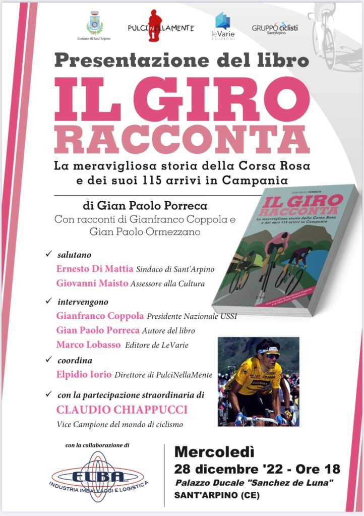 Sant’Arpino si tinge di rosa con “Il GIRO RACCONTA. La meravigliosa storia dei 115 arrivi della Corsa Rosa in Campania” (Edizioni LeVarie). Il libro del medico-scrittore Gian Paolo Porreca sarà presentato mercoledì 28 dicembre, a partire dalle ore 18, nel suggestivo scenario del seicentesco Palazzo Ducale “Sanchez de Luna” di Sant’Arpino.