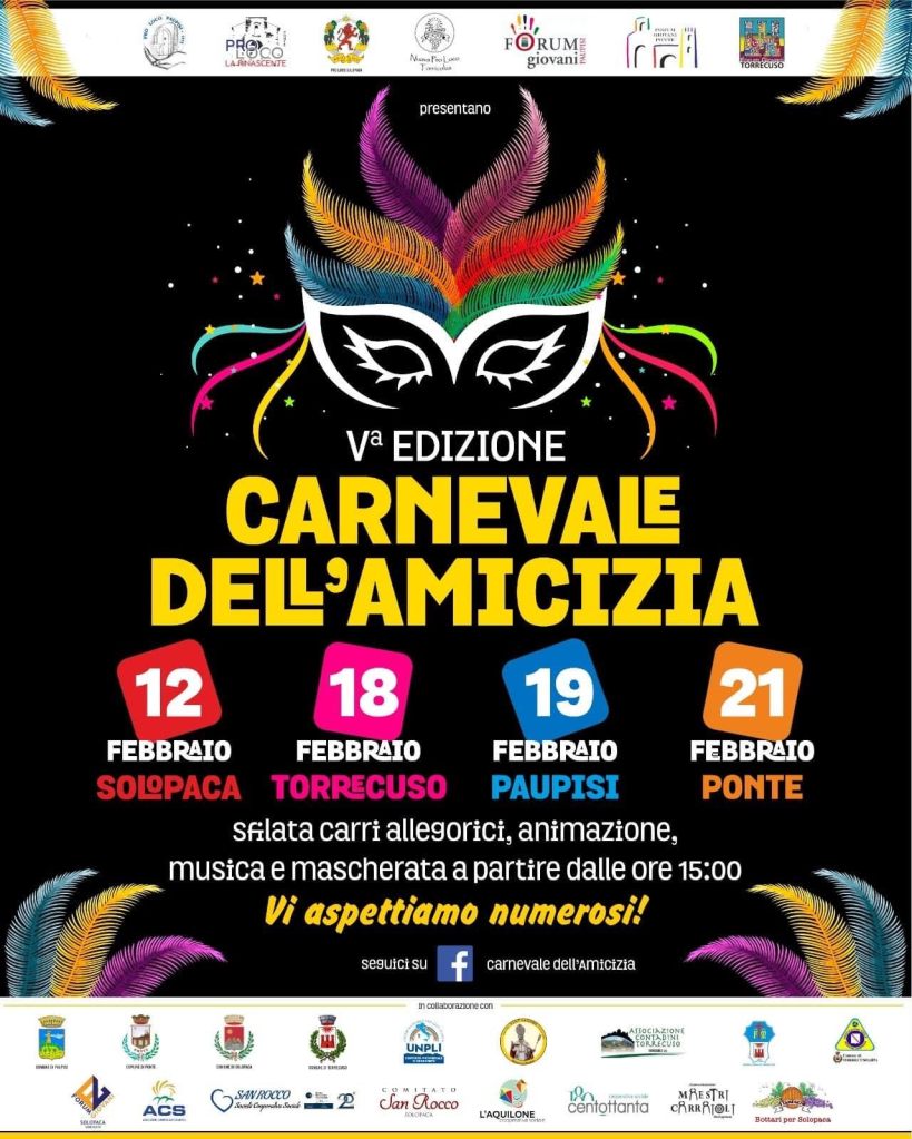 Il Carnevale dell’Amicizia sarà strutturato in quattro giornate una per ogni paese con sfilate di carri allegorici, mascherate, giochi e spettacoli vari. Si inizierà a Solopaca domenica 12 febbraio, seguirà poi Torrecuso sabato 18 febbraio e Paupisi domenica 19 febbraio con le conclusioni a Ponte martedì 21 febbraio. Il programma sarà alquanto ricco e verrà ufficializzato nei prossimi giorni.