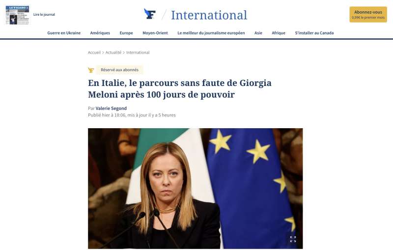 (ANSA) – Il quotidiano francese Le Figaro, celebra oggi “i 100 giorni senza errori” di Giorgia Meloni al governo, “durante i quali la sua popolarità ha conosciuto un aumento spettacolare”.