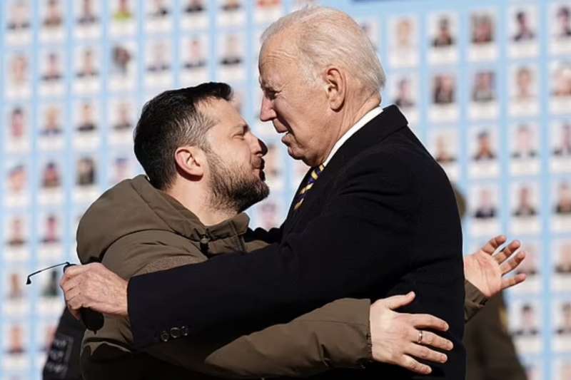 L’abbraccio fra Biden e Zelensky nel centro di Kiev