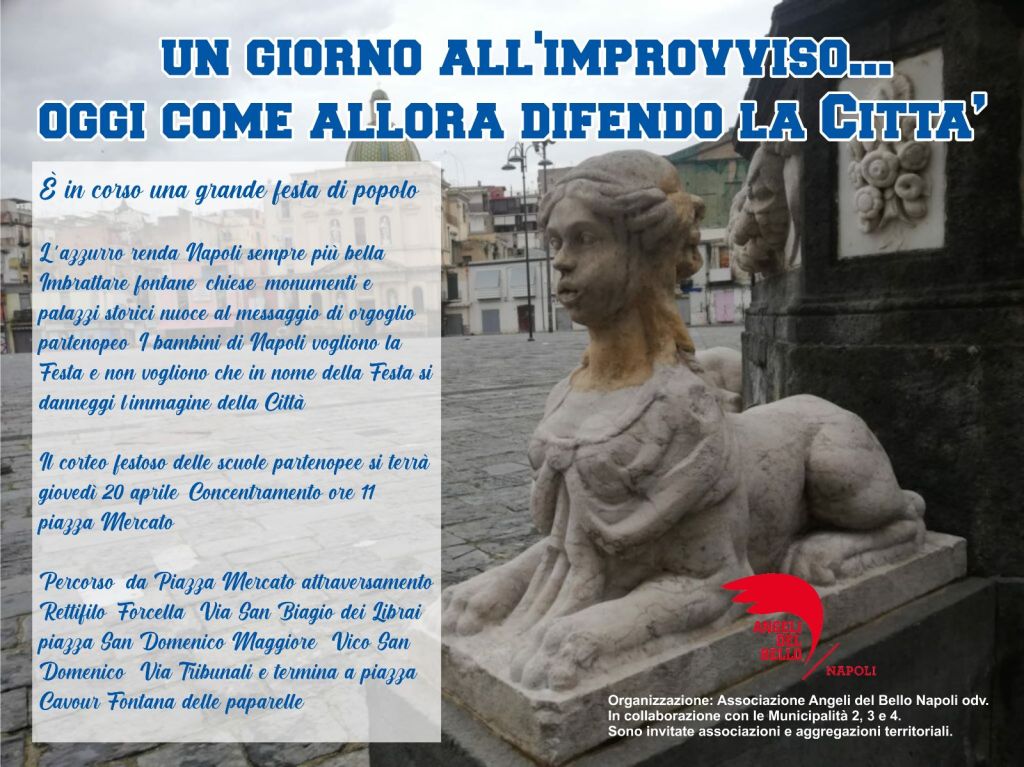 “Sarò con te… ma tu non devi sporcare”: è con l’incipit dell’inno più amato dai Napoletani in questi giorni di inizio della festa popolare più grande ed attesa da 33 anni, che si aprirà il corteo gioioso delle scuole e delle associazioni partenopee, in collaborazione con le Municipalità 2, 3 e 4, giovedì 20 aprile dalle ore 11:00 con concentramento in Piazza Mercato per sfilare nel Centro Storico di Napoli attraverso Forcella, Via San Biagio dei Librai, Piazza San Domenico Maggiore, Vico San Domenico Maggiore, Via Tribunali, Via Duomo Sagrato del Duomo per concludersi in piazza Cavour, “Fontana delle Paparelle”.