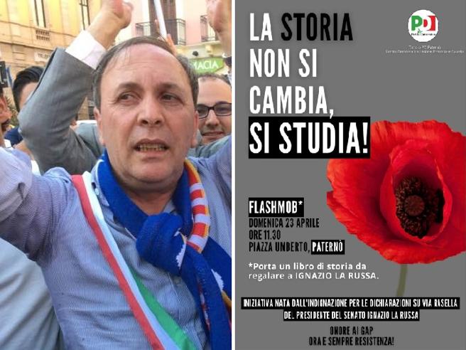 (di Lara Sirignano – corriere.it) – Con un’ordinanza firmata ieri il sindaco di Paternò Nino Naso, un anno fa rieletto primo cittadino, ha disposto che vengano oscurati i manifesti del Partito Democratico sul flashmob dal titolo «La storia non si cambia, si studia» organizzato in vista del 25 aprile. Lo scopo dell’iniziativa, nata dopo le dichiarazioni del presidente del Senato sulla strage di Via Rasella e lo slogan della manifestazione: «Porta un libro di storia a Ignazio La Russa» non sono piaciuti a Naso, espressione di liste civiche di centro-destra, che ha deciso di cancellare i manifesti, ormai affissi per le vie del paese.