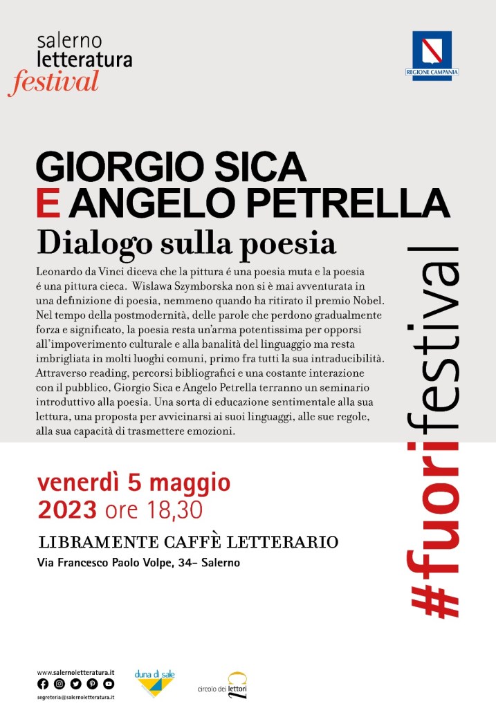 SALERNO. Nuovo appuntamento con i #Fuorifestival di Salerno Letteratura. Venerdì 5 maggio, alle 18.30, presso gli spazi di Libramente Caffè Letterario (via Francesco Paolo Volpe 34), si terrà un dialogo sulla poesia con Angelo Petrella e Giorgio Sica.