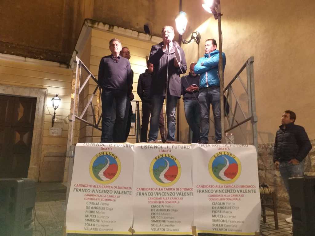 In piazza Umberto I, fra applausi scroscianti ed entusiasmo collettivo, il candidato sindaco Franco Vincenzo Valente ha presentato ufficialmente al pubblico gli esponenti della sua lista “San Lupo – Noi… Il Futuro”: Pietro Ciaglia, Olga De Angelis, Marco Fiore, Lorenzo Mucci, Francesco Simeone, Carmine Solla, Giovanni Velardi.
