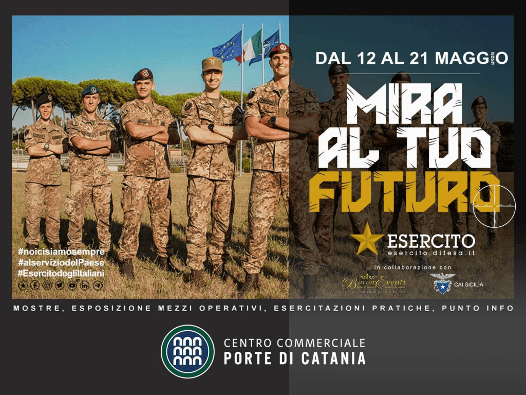 (di Stefano Baudino – lindipendente.online) – Al centro commerciale Porte di Catania sta andando in scena una dieci giorni di mostre, esercitazioni pratiche, esposizioni di mezzi operativi e sistemi d’arma e vari stand informativi organizzata dall’Esercito italiano, in partnership con il CAI, Club Alpino Italiano. Il titolo, “Mira al tuo futuro“, è tutto un programma, così come la locandina dell’iniziativa, che mostra nove soldati sorridenti in tenuta mimetica. Alle loro spalle, tre bandiere: quella italiana, quella dell’Unione Europea e, ovviamente, quella della NATO. Il tutto è corredato dagli hashtag #noicisiamosempre, #alserviziodelPaese e #EsercitodegliItaliani.