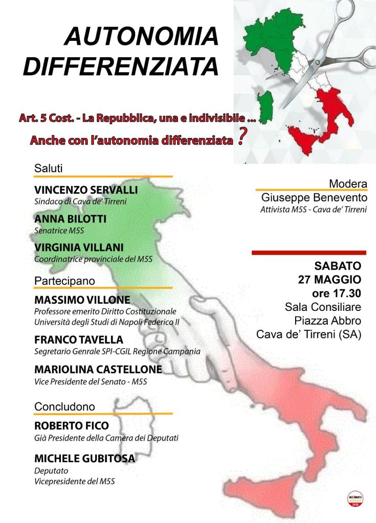 Se ne parlerà sabato 27 maggio alle ore 17.30 presso la sala consiliare del Comune di Cava de’ Tirreni. Aprire al confronto tra più voci sui temi quali la scuola, la sanità, l’economia e il welfare: settori strategici sui quali, riforme ancora da definire, potrebbero avere un impatto radicale con il rischio che nelle Regioni del Mezzogiorno si possa cristallizzare l’antica Questione Meridionale. Al convegno parteciperanno esponenti di spicco della politica e delle istituzioni tra cui Massimo Villone, Professore emerito Diritto Costituzionale Università degli Studi di Napoli Federico II; Franco Tavella, Segretario Generale SPI-CGIL Regione Campania; Mariolina Castellone, Vicepresidente del Senato – M5S; il Sindaco di Cava de’ Tirreni, dott. Vincenzo Servalli; la coordinatrice del Movimento 5 Stelle in provincia di Salerno Virginia Villani; la Senatrice Anna Bilotti e le conclusioni saranno affidate a Roberto Fico, già Presidente della Camera dei Deputati e Michele Gubitosa Deputato e Vicepresidente del M5S. A dirlo è il gruppo territoriale del Movimento 5 stelle di Cava de’ Tirreni.