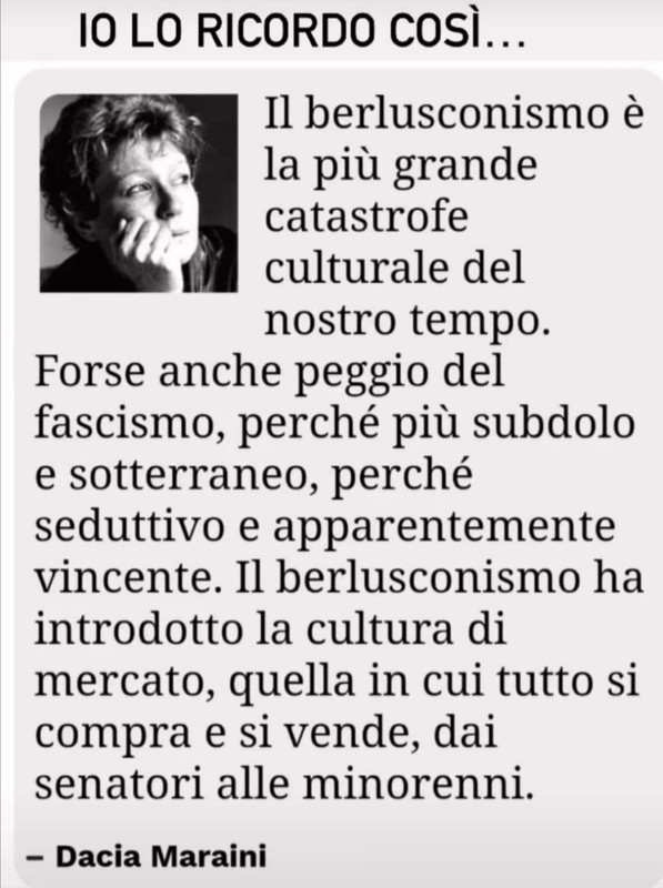 Una cosa però mi sta venendo in mente, e la temo più di molto altro: e cioè che quel delinquĕnte riesca a fare danni anche da schiantato, come ben stiamo vedendo tra sostenitori che lo piangono in piazza Duomo a Milano (invero piena solo a metà, per fortuna) e schifosi servi in piena fregola da sleccamento che dichiarano lutto nazionale per trenta giorni nel pieno del delirio, che fanno riverenze come automi, esattamente come lui aveva loro insegnato a fare sempre. Che poi è la cosa che mi manda più in bestia di tutte, laddove io dichiarerei il 12 giugno FESTA nazionale, a ‘sto punto.