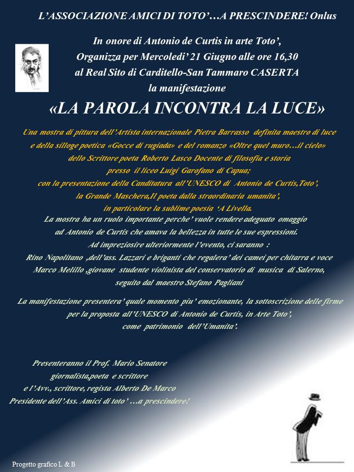L’Associazione Amici di Totò…a prescindere! – Onlus, in onore di Antonio de Curtis in arte Totò, organizza la manifestazione “LA PAROLA INCONTRA LA LUCE”, presso il Real Sito di Carditello – San Tammaro (CE), il prossimo Mercoledì 21 giugno alle ore 16:30.