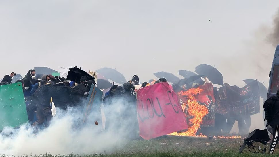 Secondo il governo francese, i Soulèvements sono un gruppo «che con la scusa di difendere l’ambiente incita a compiere sabotaggi». Nello specifico, «giocano un ruolo importante nella concezione, diffusione e legittimazione di un modo di operare violento nel quadro della contestazione di alcuni progetti di pianificazione territoriale», si legge nelle cinque pagine di inquisitoria pubblicate dal ministro degli Interni Gérald Darmanin. Il riferimento è alla contestazione delle opere avvallate dal governo, come nel caso delle strutture a favore delle lobby dell’agribusiness. Hanno fatto il giro del mondo le immagini della manifestazione dello scorso marzo, quando a Saint-Soline trentamila persone hanno protestato contro la costruzione di un grande bacino idrico voluto da una cooperativa di agricoltori e appoggiato dall’esecutivo, che ha militarizzato l’area. Al lancio di pietre e molotov dei primi, gli agenti hanno risposto usando lacrimogeni, idranti e granate stordenti, ferendo più di 200 persone.