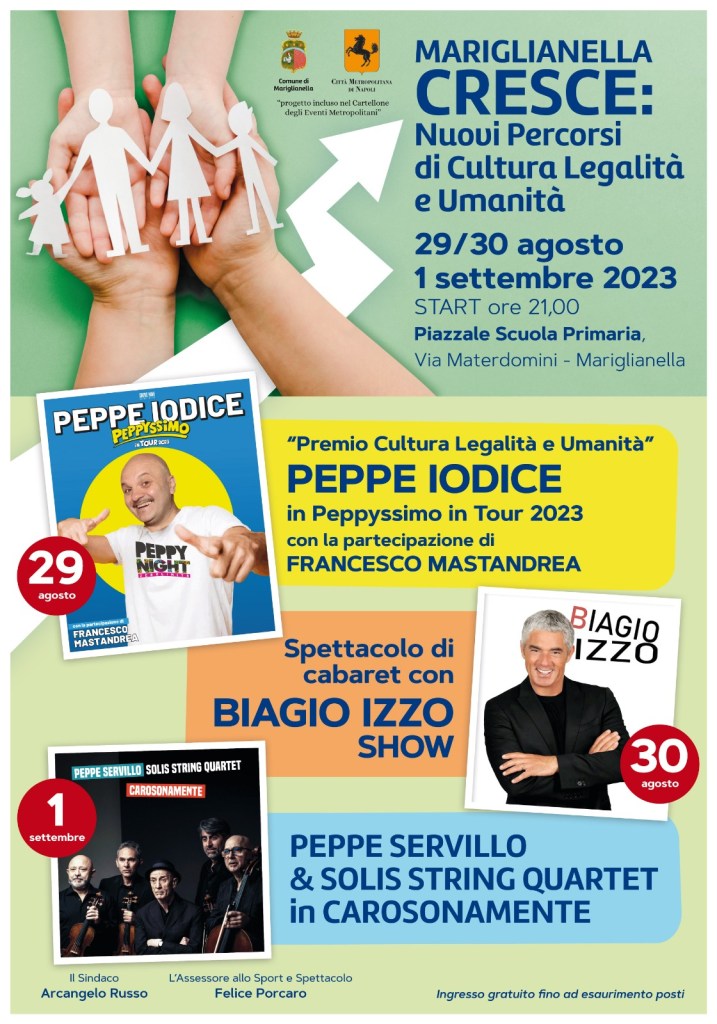 Tutto pronto per la seconda edizione di “Mariglianella Cresce: Nuovi Percorsi di Cultura Legalità e Umanità.”, il progetto nato per rivitalizzare il territorio e rinnovare il senso di comunità della cittadina in provincia di Napoli. Si comincia martedì 29 agosto con il cabaret di Peppe Iodice, in “Peppyssimo in Tour 2023” con la partecipazione di Francesco Mastandrea, per replicare, mercoledì 30 agosto con la comicità di Biagio Izzo. Ultimo appuntamento il 1° settembre con la grande musica di Peppe Servillo e Solis String Quartet, che porteranno in scena lo spettacolo “Carosonamente”. Tutti gli spettacoli si terranno a partire dalle ore 21.00 presso il Piazzale retrostante la Scuola Primaria in via Materdomini, a Mariglianella. Durante le serate avverrà anche la consegna del Premio Cultura Legalità e Umanità “Avv. Vincenzo Consales” ad un illustre rappresentante della cittadina distintosi per le sue attività nel campo del sociale. A presentare e aprire le tre serate sarà il popolare showman Enzo Costanza. L’ingresso è gratuito, fino ad esaurimento dei posti a sedere. Tre giorni di grandi appuntamenti, dunque, per chiudere il periodo estivo all’insegna dell’allegria e del buon umore, senza dimenticare i temi importanti per la comunità. Il progetto “Mariglianella Cresce: Nuovi Percorsi di Cultura Legalità e Umanità.” è promosso dall’Amministrazione Comunale di Mariglianella e incluso nel Cartellone di Eventi Metropolitani.