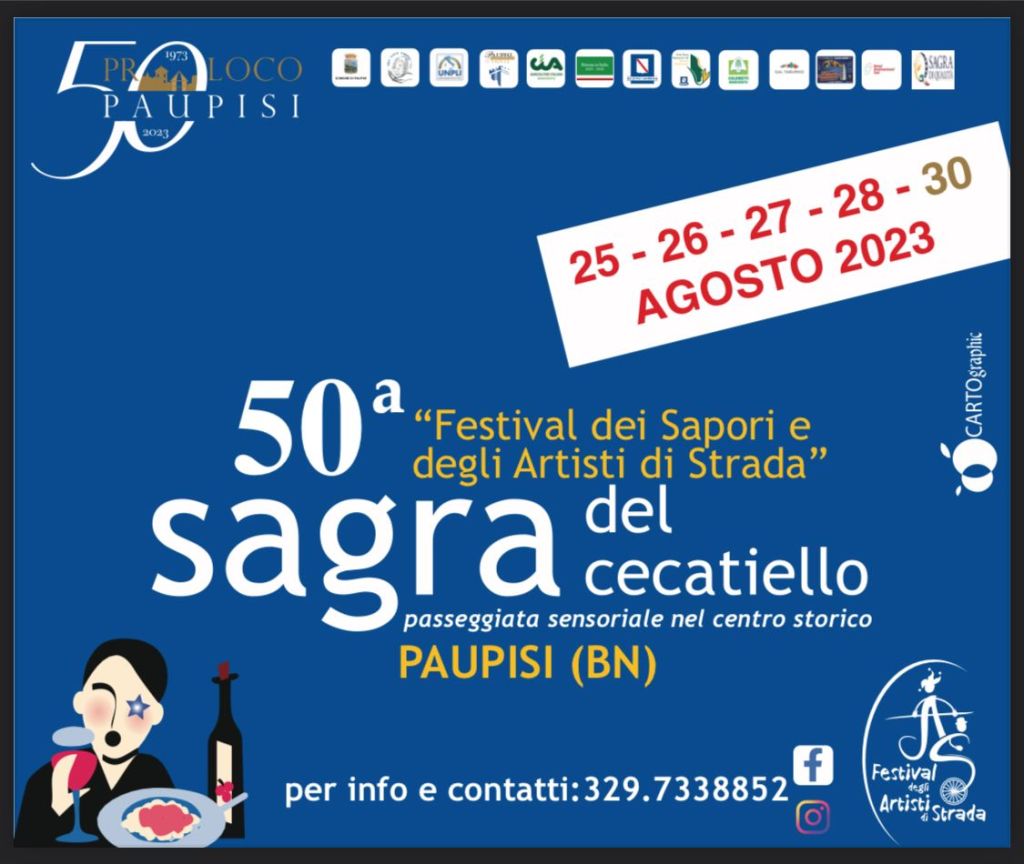 Domani venerdì 25 agosto a Paupisi, grazioso borgo in provincia di Benevento ai piedi del Taburno, si alza il sipario sul ‘Festival dei Sapori e degli Artisti di Strada – 50° Sagra del Cecatiello’ in programma fino a mercoledì 30 agosto ed organizzata dalla Pro Loco di Paupisi in sinergia con il Comune di Paupisi e con il patrocinio della Regione Campania, Comune di Fragneto Monforte, Gal Taburno, Coldiretti, CIA, Parco Regionale Taburno-Camposauro, Unpli Provinciale, ‘Club Areostatico Wind & Fire’, ‘Moto Club Legio Linteata-Benevento’, associazione ‘Trekking Camposauro’, ‘Arcieri del Sannio’, parrocchia Santa Maria del Bosco, ‘Motomaniaci’ e Rete Destinazione Sud. Evento co-finanziato dal ‘POC Campania 2014-2020. Rigenerazione urbana, Politiche per il Turismo e la Cultura. Programma Unitario di Percorsi Turistici di tipo culturale, naturalistico ed enogastronomico di portata nazionale ed internazionale’ che rientra nella brandy identity “Campania.Divina”.