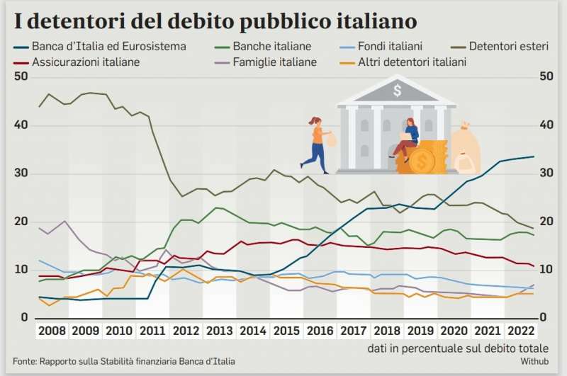 Altro dato che colpisce è il calo della quota di debito pubblico detenuto dalle famiglie; in calo continuo a dimostrazione di come la capacità di risparmio delle famiglie italiane sia diminuito (impoverimento).