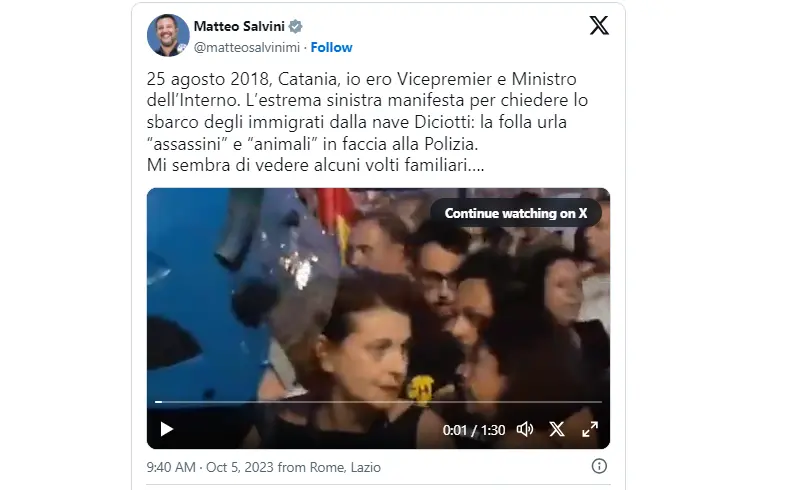 Uno zoom in avanti, un primissimo piano al volto di una donna che non partecipa ai cori dei manifestanti ma osserva in prima fila i poliziotti davanti a lei, poi i caschi della polizia che entrano nell’inquadratura. Il video, datato 25 agosto 2018 comincia così e a poca distanza dalle riprese c’è la nave Diciotti con 177 migranti a bordo trattenuti da giorni. «Mi sembra di vedere alcuni volti familiari….», è il messaggio di Salvini – che per il caso Diciotti non è finito a processo solo perché il Senato negò l’autorizzazione a procedere per lui –, con un riferimento chiaro alla giudice Iolanda Apostolico ma senza nominarla direttamente.