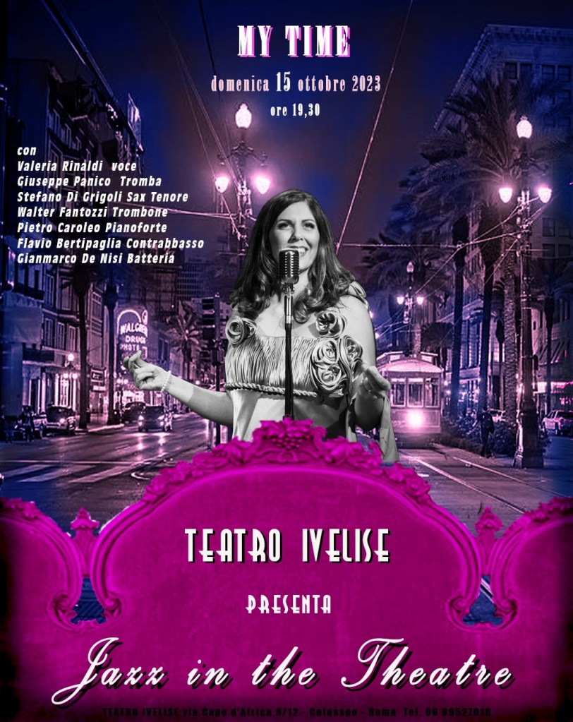 “MY TIME sarà un vero e proprio concerto di musica. Quindi ci distacchiamo momentaneamente dal varietà per presentare un lavoro musicale che sarà presto racchiuso in un nuovo album. La formazione strumentale è composta da sette elementi, Valeria Rinaldi voce, Giuseppe Panico tromba, Stefano Di Grigoli sax tenore, Walter Fantozzi trombone, Pietro Caroleo pianoforte, Flavio Bertipaglia contrabbasso e Gianmarco De Nisi batteria. Gli arrangiamenti in chiave jazzistica, sono interamente curati da Stefano Di Grigoli, le composizioni sono per lo più originali scritte da me e dallo stesso Stefano Di Grigoli. Era il disco che appettavo da tempo! Nuova linfa che nutre la fame di musica e che stimola al cambiamento. Un disco un po’ autobiografico che racconta della consapevolezza raggiunta” continua Valeria Rinaldi.