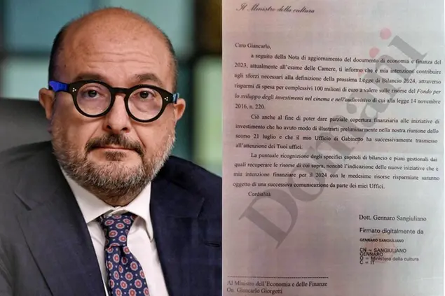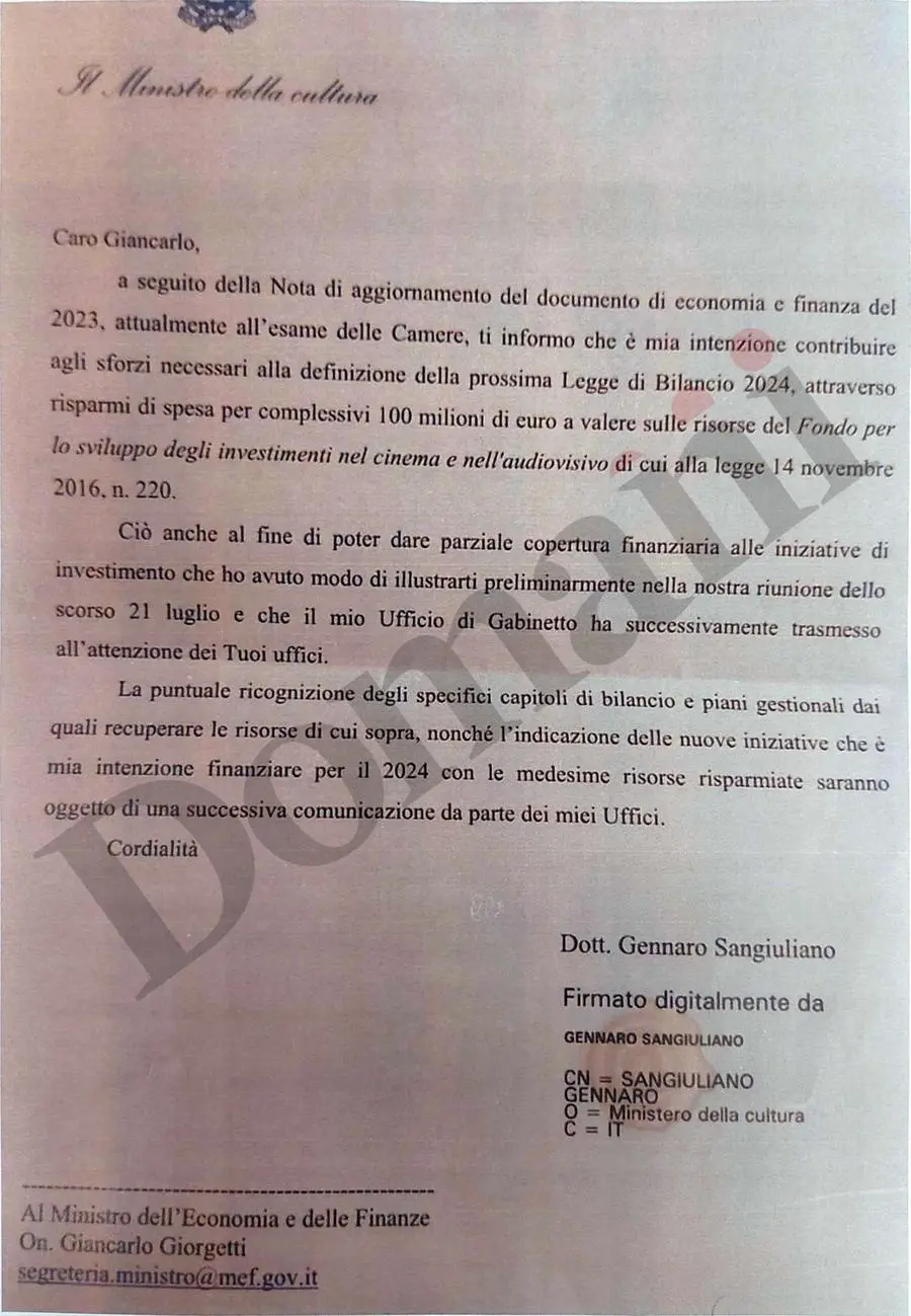 «Caro Giancarlo, […] ti informo che è mia intenzione contribuire agli sforzi necessari alla definizione della prossima Legge di Bilancio 2024, attraverso risparmi di spesa per complessivi 100 milioni di euro a valere sulle risorse del Fondo per lo sviluppo degli investimenti nel cinema e nell’audiovisivo», si legge nella lettera che Domani rivela in esclusiva.