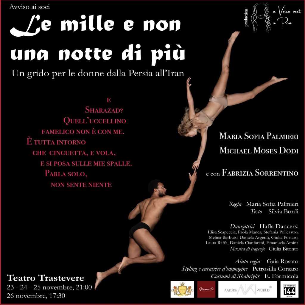 Dalla classica storia delle Mille e una notte, la battaglia per la vita di Shahrazad che ogni sera racconta favole meravigliose al suo sultano per non essere decapitata, al dramma dell’Iran di oggi, dove un regime sanguinario tortura e uccide donne, uomini e ragazzi: è il tema di “Le Mille e non una notte di più–Un grido per le donne dalla Persia all’Iran”, piéce teatrale di Silvia Bordi che va in scena al Teatro Trasteveredal 23 al 26 novembrecon la regia di Maria Sofia Palmieri, che ne è anche interprete con Michael Dodi e con Fabrizia Sorrentino. In scena anche ledanzatrici Paola Manca & ElisaScapecciaela partecipazione della cantanteFreaky Bea.