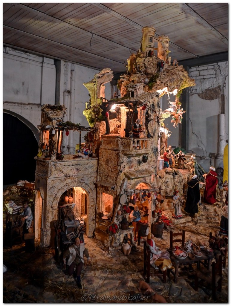 La struttura scenografica, infatti, opera dell’artigiano presepiale Salvatore Iasevoli, è realizzata secondo i dettami tradizionali di un presepio in legno e sughero con l’innovazione del rivestimento di un sottilissimo impasto di acqua e farina debitamente trattato con protettivi ed antiparassitari che in questo innovativo connubio hanno dato vita ad un suggestivo quanto inusuale presepio artistico, unico nel suo genere e che consente ai visitatori di ammirarlo da ogni parte girandoci intorno!
