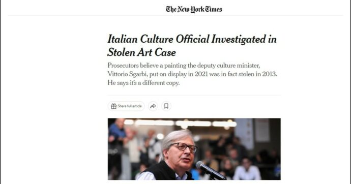 (ilfattoquotidiano.it) – “Italian Culture Official Investigated in Stolen Art Case“. Ovvero: “Sottosegretario italiano alla Cultura indagato per un caso di opera d’arte rubata”. Il titolo è inequivocabile, la vicenda è ormai arcinota, la testata è la più importante del mondo. Perché a raccontare tutta la storia dell’indagine a carico di Vittorio Sgarbi, accusato di riciclaggio per il quadro di Manetti rubato nel castello di Burzio, ora è addirittura il New York Times. In un lungo articolo, il quotidiano statunitense – punto di riferimento dei media di tutto il pianeta – ha ripercorso tutte le tappe dell’inchiesta del Fatto Quotidiano e di Report, entrambi citati: si parte dalla denuncia per furto del 2013, quando la tela venne trafugata, per arrivare al 2021, ovvero alla mostra di Lucca in cui l’opera magicamente riappare. Poi si arriva ai giorni nostri, con l’iscrizione del sottosegretario del Governo Meloni nel registro degli indagati e con il sequestro della tela all’interno del deposito di un immobile di Ro Ferrarese di proprietà di Sgarbi. Il New York Times, inoltre, ha provato a raccogliere la versione del critico tramite il suo legale. “L’avvocato di Sgarbi, Giampaolo Cicconi, ha rifiutato di essere intervistato da un giornalista del New York Times – si legge nell’articolo – scrivendo in una email che “in questa fase delicata non intendo rilasciare dichiarazioni”.