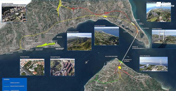 Tra le opere accessorie al Ponte ci sono opere stradali e ferroviarie di collegamento del Ponte al territorio che comprendono 40 km di raccordi viari e ferroviari (circa l’80% sviluppati in galleria). Le arterie stradali e su ferro, spiega la società, «collegheranno, dal lato Calabria, l’autostrada del Mediterraneo (A2) e la stazione FS di Villa San Giovanni e, dal lato Sicilia, le autostrade Messina-Catania (A18) e Messina-Palermo (A20) nonché la nuova stazione FS di Messina». Si tratta di 20,3 km raccordi stradali complessivi e 20,2 km raccordi ferroviari complessivi. Stretto di Messina conferma anche « la realizzazione, sul lato siciliano, di tre fermate ferroviarie in sotterraneo (Papardo, Annunziata, Europa) che, unite alle stazioni di Villa S. Giovanni, Reggio Calabria e Messina daranno concretezza al sistema metropolitano interregionale dell’area dello Stretto». Tra le altre infrastrutture, anche il Centro Direzionale (lato Calabria) progettato dallo “Studio Daniel Libeskind”, i cui aspetti architettonici saranno approfonditi in sede di progettazione esecutiva.