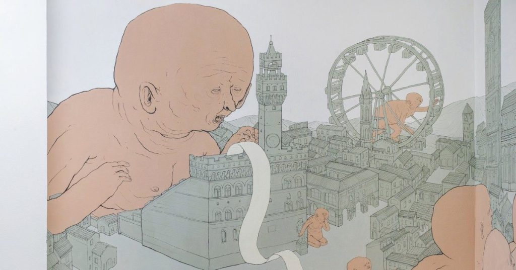 Il risultato è mirabile, artisticamente e concettualmente: sulle pareti vediamo moltiplicarsi gli inquietanti vecchi-bambini nudi di Nemo’s, che popolano una Firenze in cui Palazzo Vecchio è ormai solo una cassa, la Cupola di Brunelleschi serve a spremere le arance di un turismo di massa, tutto (culminando nella ridicola ruota panoramica voluta dal sindaco) è ridotto a un luna park per ricchi e mentre la rendita trasforma le case del centro in salvadanai tutto si dorme per strada, tra i cartoni.