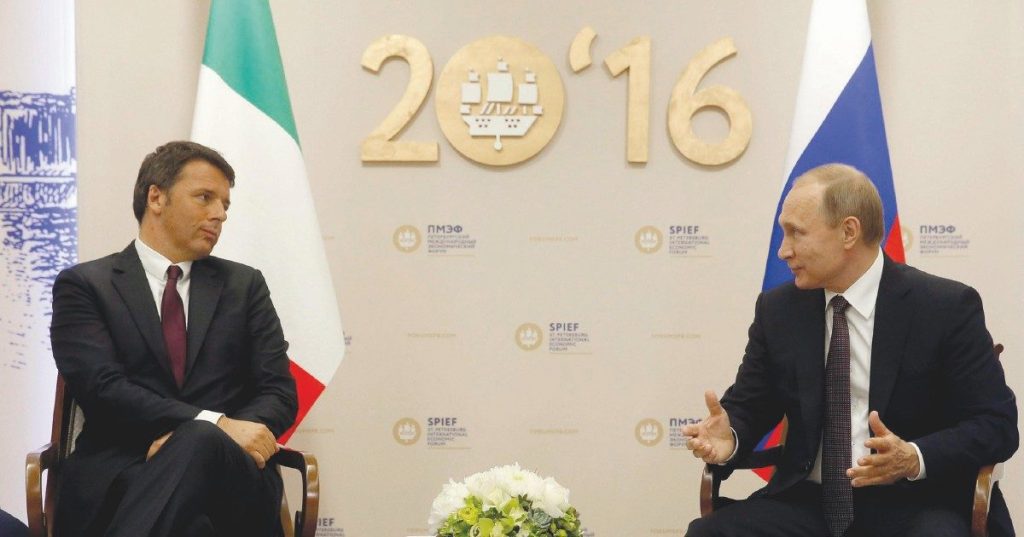 È l’inizio di un’altra grande storia di “amicizia”, tanto è vero che l’Italia e la Russia fanno affari d’oro soprattutto su gas e armi. Renzi incontra Putin il 5 marzo 2015 e poi, a giugno, il presidente russo visita l’Expo di Milano. Renzi è raggiante: “Lo accolgo con grande gioia”. I problemi ci sono – “viviamo in un quadro internazionale difficile” è la perifrasi per non citare la guerra nel Donbass – ma bisogna fare uno sforzo per superarli: “Lavoreremo insieme per ripartire dalla tradizionale amicizia Italia-Russia”. In quei mesi Renzi parla due volte al Foglio e ribadisce concetti simili: “Dobbiamo metterci in testa che avere la Russia a bordo della comunità internazionale è importante”. E ancora: “La Russia ha un ruolo strategico, bisogna mediare, nessuno può avere un interesse vero a mettere in ginocchio la Russia”.