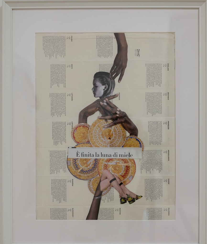 Michela Mattei ha presentato per la collettiva un collage dal titolo È finita la luna di miele, chiaro messaggio di una consapevolezza femminile raggiunta: “È finita la luna di miele è il mantra che lega insieme ogni riferimento visivo presente nella composizione” queste le parole dell’artista “La mano e l’urgenza di visualizzare hanno preceduto il pensiero di mettere insieme i pezzi. Il collage si è rivelato nelle sue stratificazioni grazie ad associazioni di immagini istintive per poi trovare un posto chiaro nel mondo, illuminato da una postura: mettere fine a una consuetudine occidentale sfarzosa simbolo di altrettante abitudini fallimentari e superflue del mondo umano.”