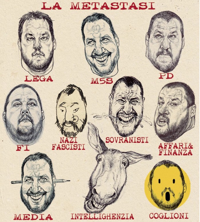 Ps. Riguardo a Salvini vedo che i suoi strepitano perché nel corso di Tagadà, su La 7, ho espresso l’auspicio che non ci venga mai a mancare, come ministro e leader, poiché con la sue “stronzate” rallegra la satira e le nostre giornate. Del resto, poiché un giudice ha già sentenziato che il nostro eroe si può tranquillamente definire “cazzaro verde”, credo di essermi tutto sommato contenuto.