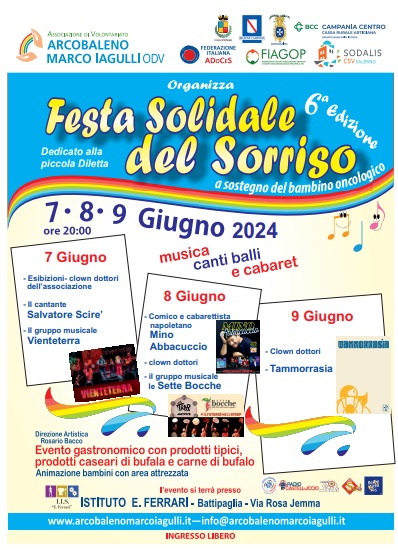 «La Festa solidale del Sorriso è un appuntamento molto importante per noi – spiega Tiziana Iervolino, presidente dell’Associazione Arcobaleno Odv-. In questi anni abbiamo sostenuto famiglie e bambini, alcuni dei quali non ci sono più. Ogni vita che si perde sotto la scure del cancro è un dolore che si rinnova, ma il nostro compito è anche e soprattutto diffondere la gioia, l’allegria e i sorrisi. Le emozioni positive, infatti, sono un’arma potente ed efficace contro ogni forma di tumore. Per questi tre giorni sono stati coinvolti circa cento volontari e i clown dottori saranno al nostro fianco con spettacoli che lasceranno senza fiato, grandi e piccini. Il loro ruolo nelle corsie pediatriche è importantissimo: le stanze asettiche dei reparti oncologici, grazie alle loro magie, prendono colore, regalando momenti di grandi serenità ai più piccoli e ai loro familiari».