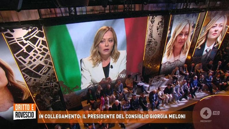 (ilfattoquotidiano.it) – Lo studio, come si dice in questi casi, è già tutto un programma: quattro “wall” – i maxi schermi a parete – proiettano il primo piano della premier, che un istante più tardi comparirà per l’intervista a Paolo Del Debbio, patron della serata del giovedì di Rete4.