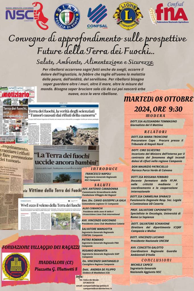 L’iniziativa è stata promossa e organizzata dalle Segreterie Regionali della Campania del Nuovo Sindacato Carabinieri, del S.I.A.P., il Sindacato Italiano Appartenenti Polizia, da CONFSAL, CONFSAL FNA e Lions Club International con l’intento di proporre e analizzare quali prospettive future possono essere attuate per l’area definita “Terra dei Fuochi”.