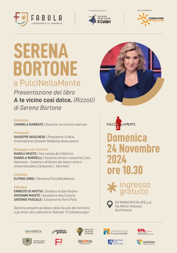 Serena Bortone, celebre giornalista e conduttrice televisiva e radiofonica, volto noto della Rai, autrice (è da poco uscito anche il suo primo romanzo, ispirato da fatti e persone della sua adolescenza, “A te vicino così dolce”, edito da Rizzoli), domenica prossima 24 novembre 2024, alle ore 10.30, a Sant’Arpino, presso il suggestivo Palazzo Ex Municipio di Atella di Napoli (in via Martiri Atellani), riceverà il Premio PulciNellaMente 2024.