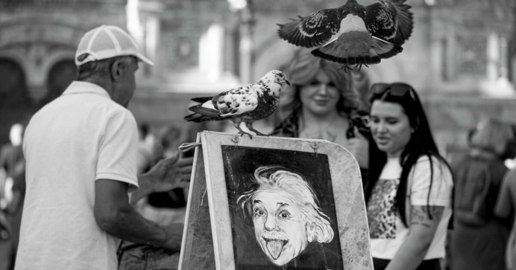 Della teoria della relatività io che sono, come quasi tutti, un ignorante in materia (“Del suo discorso astratto ci ho capito poco o niente” Sancio Panza nella canzone di Guccini, Sancio che aggiunge “Credo solo in quel che vedo e la realtà per me rimane il solo metro che possiedo, com’è vero… che ora ho fame!”) credo di aver compreso una sola cosa: che anche la relatività è relativa. Tanto che lo stesso Einstein dovette fare continui aggiornamenti della sua teoria parlando di una “relatività speciale”. Del resto tutto cambia a seconda del punto di osservazione di chi osserva qualsiasi fenomeno. È, dal punto di vista artistico, l’intuizione di Duchamp che mettendo una bicicletta su un piedistallo afferma: “Questa è un’opera d’arte per la sola intenzione dell’artista” che darà inizio alla cosiddetta “arte concettuale” e si spalancheranno le porte agli imitatori deficienti che a una Biennale di Venezia, ma è solo un esempio, metteranno sul palcoscenico, pretendendo che sia arte, dei mongoloidi.
