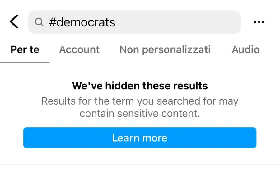 Perché non c’è solo questo: alcuni argomenti su Instagram, contraddistinti con uno specifico hashtag, hanno smesso per diverse ore di restituire risultati, martedì mattina. In questo caso, era più facile averne una prova empirica. Cercando per esempio “#democrats” (o #democrat), compariva la scritta “We’ve hidden these results” (“Abbiamo nascosto questi risultati”). E poi, ancora in inglese: “I risultati che hai cercato potrebbero contenere contenuti sensibili”. Lo stesso non accadeva per esempio cercando “republicans”.