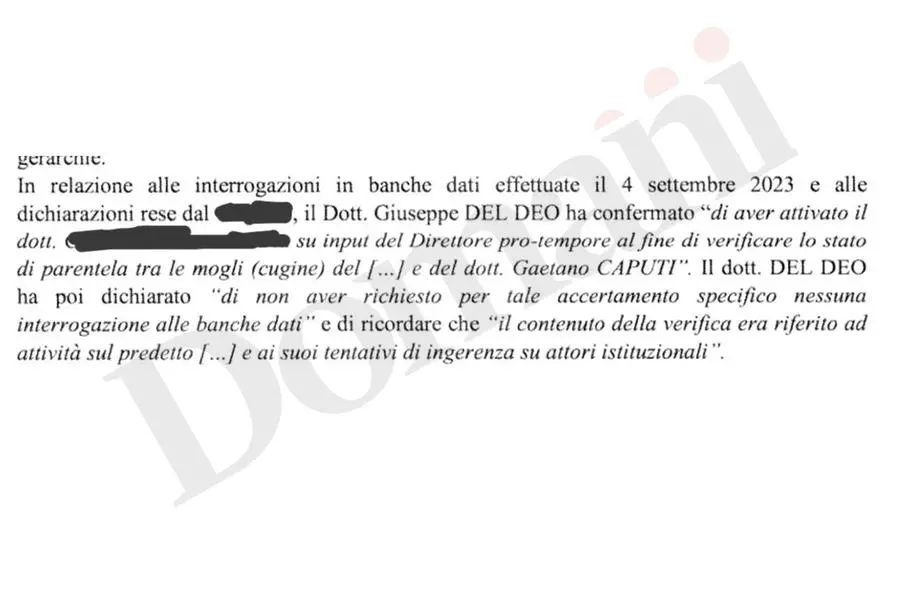 Chi aveva ordinato all’agente, di cui non facciamo il nome, di indagare sulla famiglia di Caputi? Nel report che manda in procura il direttore Valensise scrive che «Giuseppe Del Deo ha confermato di aver attivato» il suo sottoposto «su input del direttore pro-tempore (Mario Parente, ndr), al fine di verificare lo stato di parentela tra le mogli del» uomo che cercava sponde a Palazzo Chigi «e del dottor Gaetano Caputi. Del Deo ha poi dichiarato «di non aver richiesto per tale accertamento specifico nessuna interrogazione sulle banche dati».