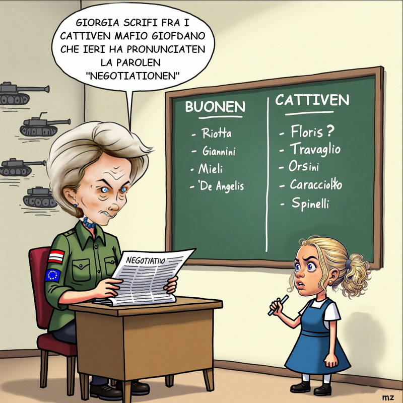 Se Netanyahu fa secchi 20 mila bambini a Gaza in un anno su una popolazione di 2,5 milioni, non fanno una piega o al massimo, se sono proprio incazzati, ripetono ciò che ha detto l’altro ieri restando seria Kaja Kallas (uno dei loro spiriti guida): “Israele ha il diritto di difendersi, ma le sue azioni attuali vanno oltre l’autodifesa proporzionata”. Nel loro personale borsino, la vita di un palestinese (o iracheno, o afghano, o libico) vale un millesimo di quella di un americano, o israeliano, o europeo (serbi e armeni esclusi). Negano persino ciò che tre anni fa raccontavano e commentavano pure loro: i negoziati russo-ucraini a Istanbul, che Usa e Uk convinsero Zelensky a disertare rifiutando condizioni molto migliori di quelle che ora subirà l’Ucraina. Devono dimostrare che con Putin non si può e non si deve parlare, perché non ha mai voluto negoziare. Non lo vuole neppure l’unico che ci prova: Trump. I testimoni di Ursula parlano come se a Gaza fossero morte 50 mila persone e in Ucraina mezzo milione sotto Trump, non sotto Biden. L’unica a volere la pace è l’Europa: infatti parla solo di guerra, non ha un negoziatore, manda a Kiev altri 23 miliardi di armi e vuole aggiungerci 30 mila soldati. Ma – precisa il Corriere – “senza mandato a combattere”. E allora che li mandano a fare? A “garantire la pace”, “monitorare la tregua”, “addestrare truppe ucraine” (ma sicuramente a coltivare fiori). In pratica faranno ciò che facevano i negoziatori ucraini e russi a Istanbul: turismo.