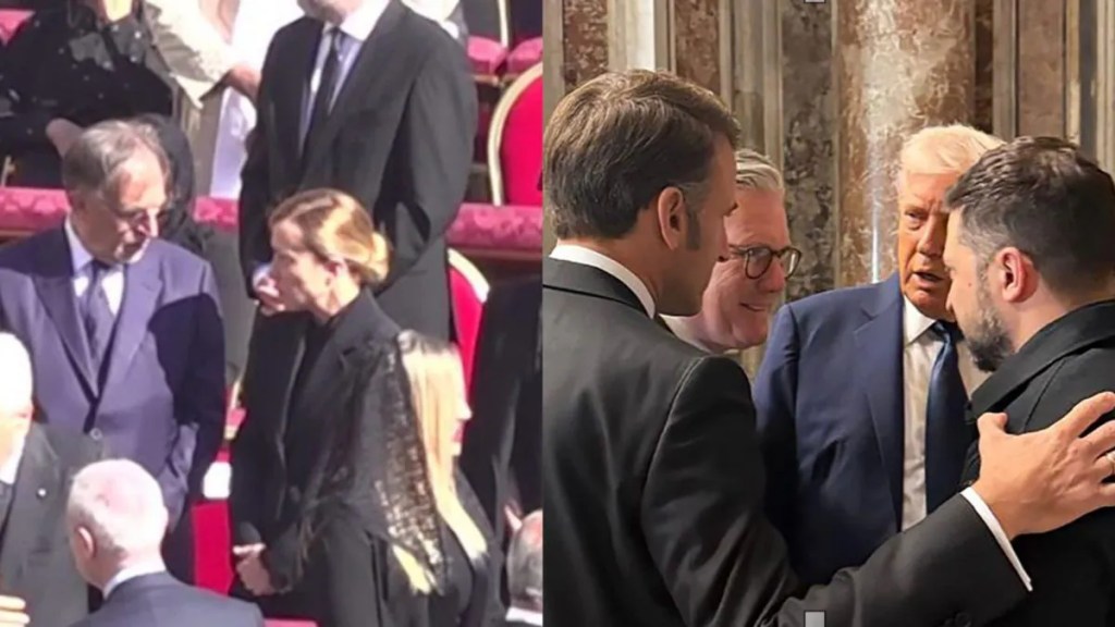 Il sagrato di San Pietro ha visto riunirsi Zelensky, Trump, Macron e Starmer, immortalati da telecamere e fotografi. Incontro a cui non ha preso parte Meloni, che invece è tornata nell’area riservata alle autorità civili dieci minuti dopo averla lasciata e per qualche minuto ha conversato con il presidente del Senato Ignazio La Russa, che a un certo punto ha scosso la testa visibilmente contrariato.