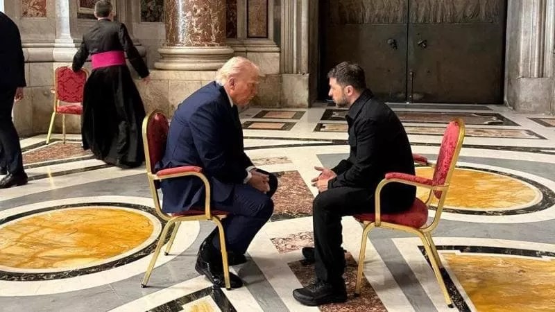 (di Michele Serra – repubblica.it) – Si chiama, la nostra, “società dell’immagine”, e dunque l’istantanea di Trump e Zelensky (in ordine alfabetico) che confabulano in San Pietro, seduti su due sedie, ha un forte impatto. Se si chiamasse “società della parola” l’impatto sarebbe molto minore: senza didascalia, quella foto è solo una foto.