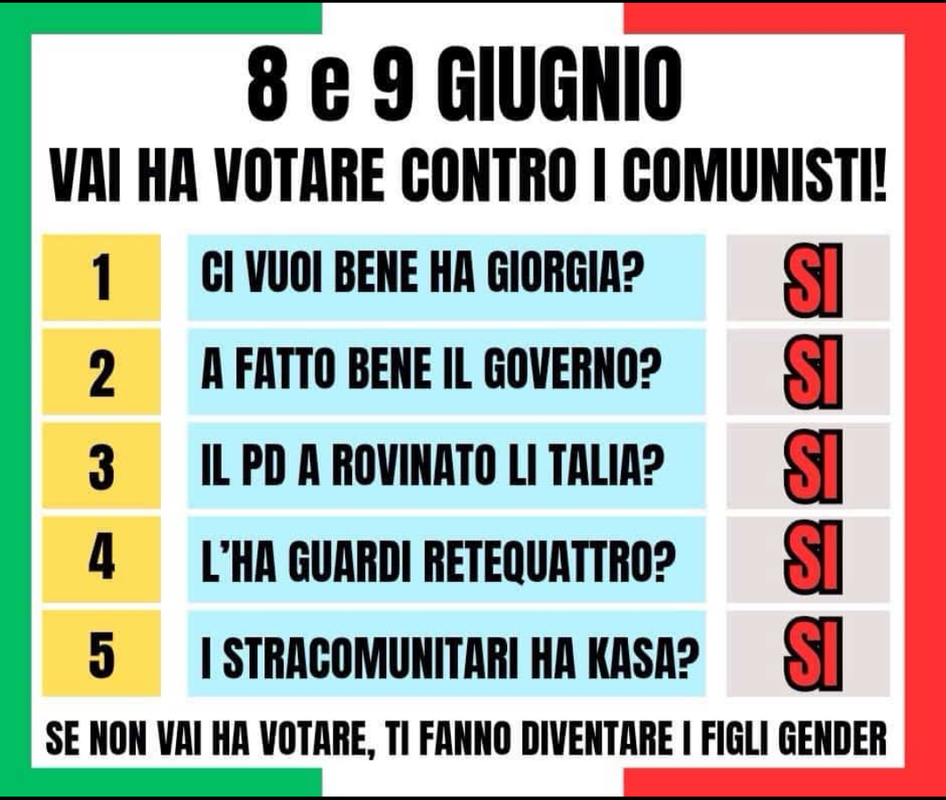 La storia del Jobs Act è emblematica. Una legge di destra fatta dal centrosinistra renziano con l’opposizione apparente della destra. Dieci anni dopo il centrosinistra lo rinnega, tenta di eliminarlo per via referendaria (anche perché per via parlamentare non reggerebbe, figuriamoci); ci si aspetterebbe il sostegno delle ex opposizioni, che invece diventate maggioranza sposano la norma; il lavoro sporco l’ha già fatto la sinistra, perché intervenire? Risultato: tutto resta com’è. Per la destra è una partita win-win, per la “sinistra” un gioco sicuro a perdere.