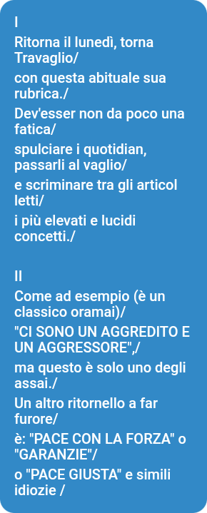 Poi questo è solo un sintomo della narrazione di Travaglio che non è incentrata sull’argomentazione o sull’esposizione di una valutazione o un opinione, lui vuole semplicemente dimostrare che ha ragione. E per dimostrarlo usa qualsiasi mezzuccio. Ovviamente, avendo la Russia invaso l’Ucraina, non può dire no non è vero e allora si aggrappa ad una excusatio personalis.