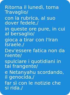(Marco Travaglio – Il Fatto Quotidiano) – Bombe pacifiste. “Israele è determinato a portare la pace in Medio Oriente: per farlo deve disinnescare la bomba iraniana. Oltre 200 caccia israeliani sono stati coinvolti questa notte nei primi attacchi contro l’Iran, sganciando oltre 330 bombe su circa 100 obiettivi” (Aldo Torchiaro del Riformista, X, 13.6). Meno male: pensa se voleva portare la guerra. […]