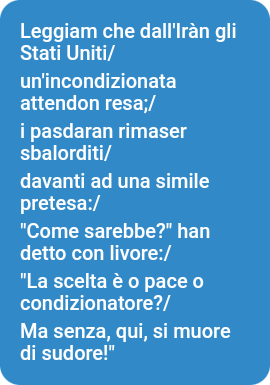 Infatti, possiamo immaginare come sarebbero gli equilibri del mondo senza più l’unico “fortilizio” militare ammerecano nell’area. Peraltro concentrato in uno stato piccolo quanto il Lazio, che i telespettatori yankee farebbero fatica a individuare su una carta geografica. Ma c’è questo rischio? Niente affatto! Ma basta la sola idea per gettare nel terrore il cowboy a stelle&strisce. E poi ci sono sempre il petrolio e il gas iraniani che fanno gola, come ci ricorda il compianto Giulietto Chiesa.