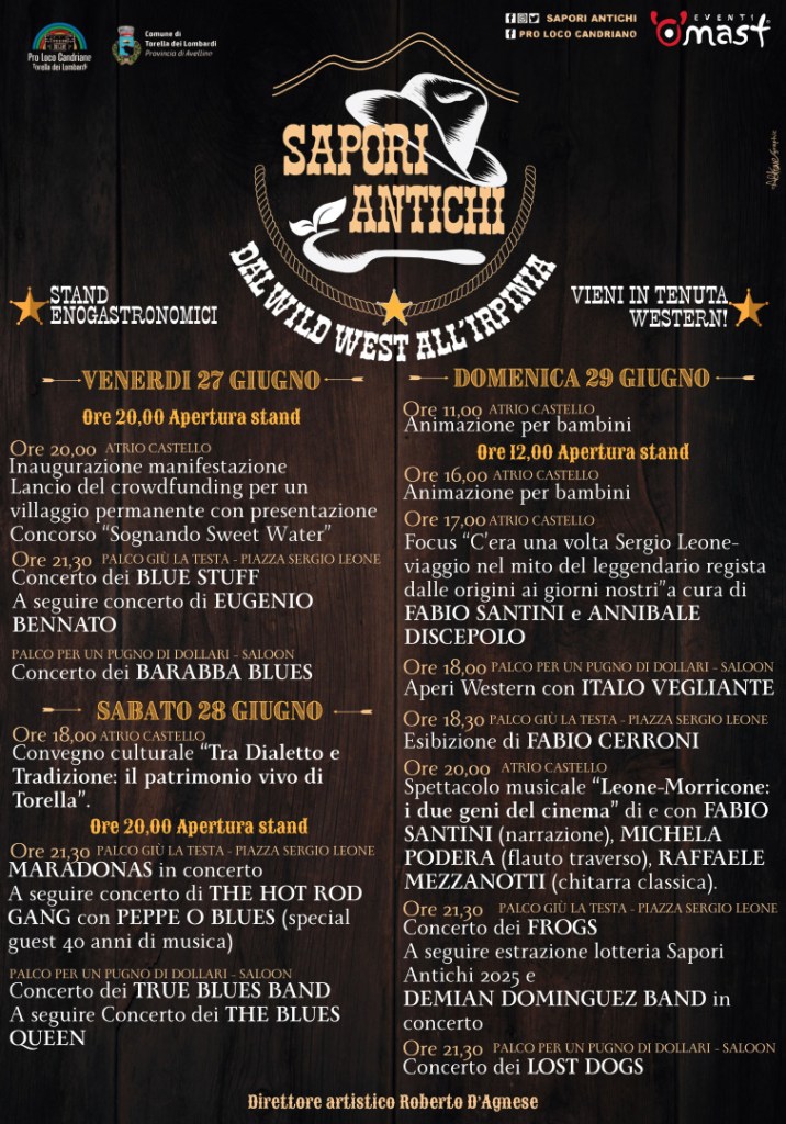Il programma comincerà venerdì 27 giugno, alle ore 20, con l’apertura degli stand e, nell’atrio del Castello, inaugurazione della manifestazione e lancio del crowdfunding per un villaggio permanente con la presentazione del concorso “Sognando Sweet Water”. Alle ore 21,30 sul palco Giù la Testa concerto dei Blue Staff e, a seguire, salirà sul palco Eugenio Bennato, nome di primo piano della tradizione popolare campana. Sul palco Per un pugno di Dollari concerto dei Barabba Blues. Sabato 28 giugno si comincerà alle ore 18 all’atrio del Castello con il convegno “Tra dialetto e tradizione: il patrimonio vivo di Torella”; alle ore 20 apertura degli stand e, alle ore 21,30, sul palco Giù la Testa Maradonas in concerto e, a seguire, concerto di The Hot Rod Gang con Peppe ‘o Blues (special guest), che per l’occasione festeggerà i suoi quarant’anni di musica, mentre sul palco Per un Pugno di Dollari concerto dei True Blues Band e, a seguire, The Blues Queen. Domenica 29 giugno alle ore 11 nell’atrio del Castello animazione per bambini. Alle ore 12 apertura stand, alle ore 16, sempre nell’atrio del Castello, animazione per bambini. Alle ore 17 focus “C’era una volta Sergio Leone – Viaggio nel mito del leggendario regista dalle origini ai giorni nostri”, a cura di Fabio Santini e Annibale Discepolo. Alle ore 18 sul palco Per un Pugno di Dollari AperiWester con Italo Vegliante, alle ore 18.30, sul palco Giù la Testa, esibizione di Fabio Cerroni. Alle ore 20, all’atrio del Castello, spettacolo musicale “Leone-Morricone: i due geni del cinema”, di e con Fabio Santini (narrazione), Michela Podera (flauto traverso) e Raffaele Mezzanotti (chitarra classica). Alle ore 21.30 sul palco Giù la Testa concerto dei Frogs. A seguire estrazione della lotteria Sapori Antichi 2025 e Demian Dominguez Band in concerto. Alle ore 21.30, sul palco Per un pugno di Dollari, concerto dei Lost Dogs.