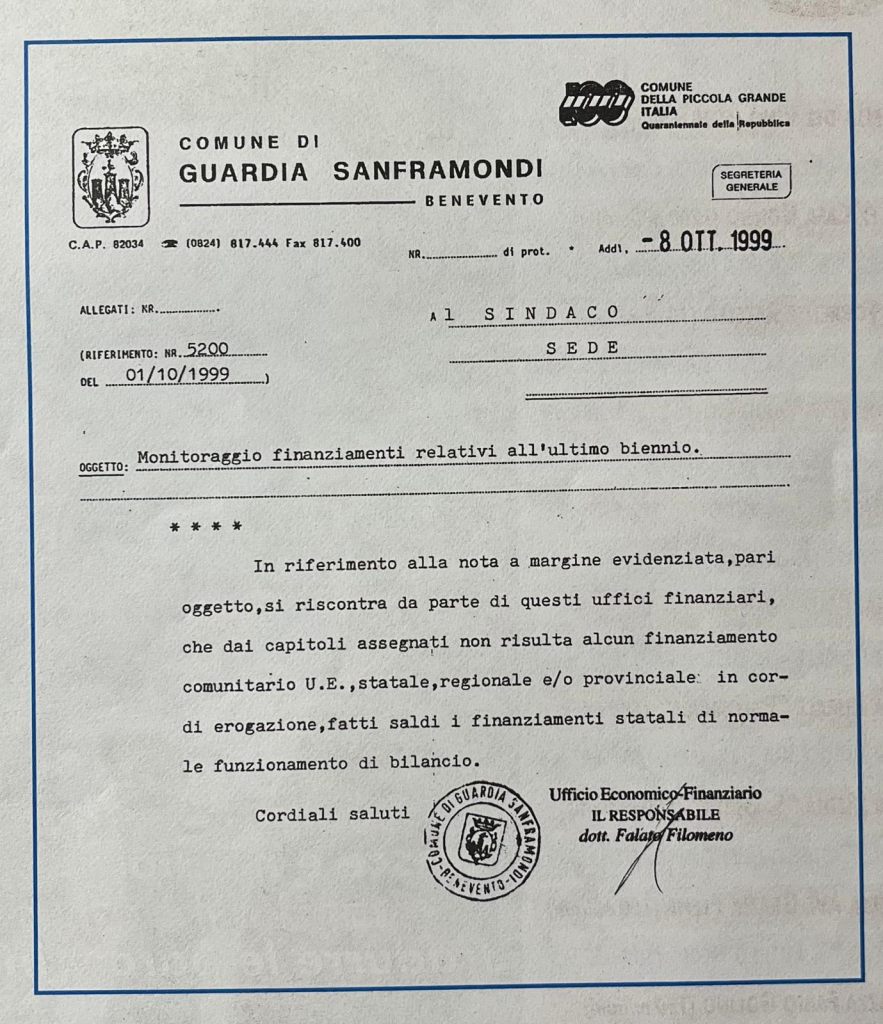 l’elemento significativo e prodromico ad ogni valutazione sui risultati di gestione è sicuramente dato dal fatto che, nell’anno in cui si riferisce il consuntivo, l’attuale amministrazione si è trovata nella difficile condizione di dover governare secondo programmi e obiettivi indicati in documenti contabili non propri perché deliberati dalla precedente amministrazione e, per amore di verità, è necessario ricordare che quando mi sono insediato (in data 23 giugno 1999) mi sono trovato nella difficile situazione di dover fronteggiare una situazione amministrativa con la cassa comunale praticamente “svuotata” e debiti da pagare nei confronti di tanti cittadini (dal benzinaio che riforniva i veicoli comunali al salumiere che forniva il mangime per gli uccelli che erano rinchiusi nella voliera della villa comunale e/o gli alimenti per i ragazzi la mensa scolastica e senza dimenticare il tipografo che per anni aveva stampato manifesti ed altro senza essere pagato). Per farla breve, la cassa comunale era praticamente “desertificata” e non vi era alcun finanziamento disponibile per realizzare un’opera pubblica. A tal proposito, per sgombrare il campo da ogni dubbio e dare a ciascuno il suo, basta leggere la nota che mi ha inviato, in data 8/10/1999, il Responsabile dell’Ufficio Finanziario, dott. Falato Filomeno, da cui si evince che: “… nell’ultimo biennio non risulta alcun finanziamento comunitario U.E., statale, regionale e/o provinciale in corso di erogazione, fatti saldi i finanziamenti statali di normale funzionamento di bilancio”.
