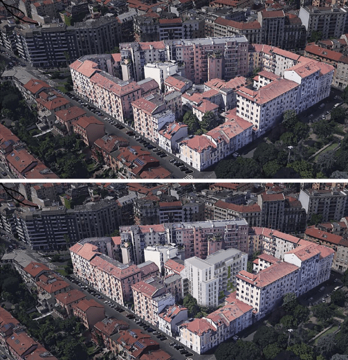 Alla fine ecco il miracolo: un’area interna, circondata da edifici non è un cortile. Si può costruire. E non basta. Demolita la palazzina di 12 metri, sorge ora una di 7 piani alta 27 metri. Toglie luce e aria a tutte le palazzine che la circondano.