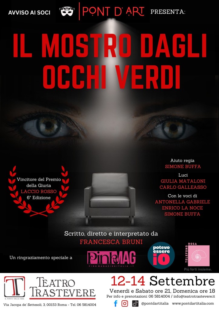 Dopo l’anteprima internazionale a Ginevra, realizzata con il patrocinio del Consolato Generale d’Italia, debutta per la prima volta in Italia, al Teatro Trastevere, dal 12 al 14 Settembre, Il Mostro dagli Occhi Verdi: un monologo intenso, ironico e dolorosamente attuale sulla violenza psicologica e la perdita di sé nelle relazioni tossiche. Otto personaggi, interpretati da una sola attrice, prendono forma sulla scena in un intreccio di storie, confessioni e paure. Flashback, dialoghi interiori e frammenti di sedute terapeutiche rivelano vite segnate da dipendenza emotiva, manipolazione e autodistruzione.