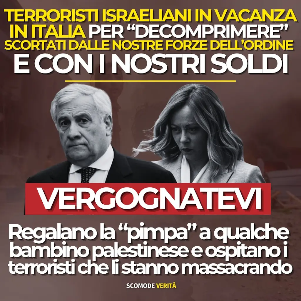 Meloni e Tajani da un lato si vantano di aver accolto tanti bambini palestinesi, dall’altro consentono ai soldati israeliani, i terroristi in divisa che hanno reso orfani gli stessi bambini, di venire in vacanza in Italia (scortati dalla Digos) per superare lo stress della guerra. È tutto ripugnante. Leggete qui 👉 https://alessandrodibattista.substack… e iscrivetevi al mio canale Substack