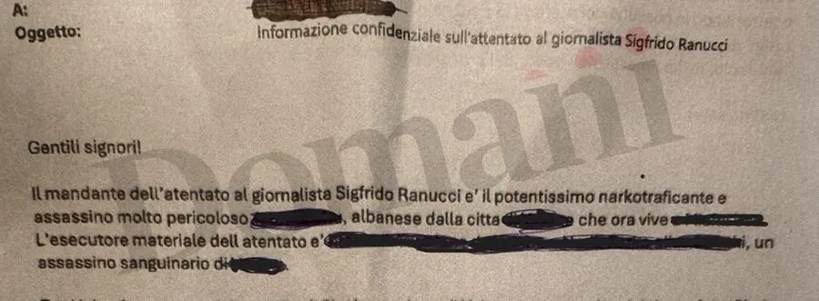 La lettera inviata da un indirizzo mail criptato inizia così: «Il mandante dell’attentato al giornalista Sigfrido Ranucci è il potentissimo narcotrafficante albanese e assassino molto pericoloso…». Le prime due righe della missiva anonima inviata alla Direzione investigativa antimafia non lasciano spazio all’immaginazione. Le successive non sono da meno: «L’esecutore materiale dell’attentato è…». Insomma nomi, cognomi, soprannomi e ruoli nell’organigramma della criminalità organizzata albanese che evitiamo di riportare integralmente perché sono appunti scritti in una segnalazione senza firma in mano ora anche a chi indaga sulla bomba esplosa giovedì 16 ottobre, poco prima che scoccassero le dieci e trenta di sera, davanti casa di Ranucci. I boss indicati hanno messo radici anche in Italia, in particolare in Toscana, nella zona di Prato.