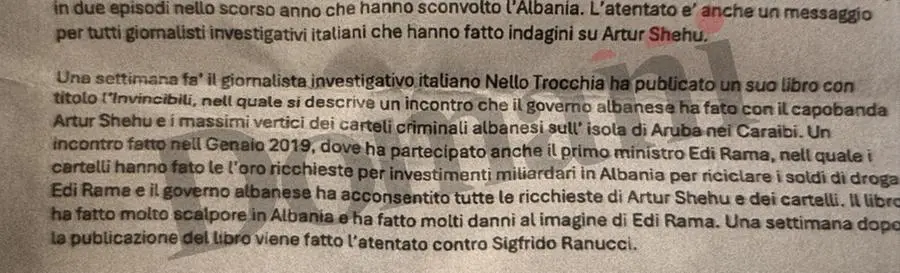 «L’attentato a Ranucci è anche un messaggio per tutti i giornalisti investigativi italiani che hanno fatto indagini su Shehu», è scritto nella missiva in mano ai detective. L’autore collega così la bomba a un altro evento scatenante: «Una settimana fa il giornalista Nello Trocchia (di Domani, ndr) ha pubblicato un suo libro nel quale si descrive un incontro che il governo albanese ha fatto con il capobanda Shehu sull’isola caraibica di Aruba. Un incontro fatto nel gennaio 2019 dove ha partecipato anche il primo ministro Edi Rama, nel quale i cartelli hanno fatto le loro richieste per investimenti miliardari in Albania per riciclare i soldi della droga. Il libro ha fatto molto scalpore in Albania e ha fatto danni all’immagine di Edi Rama. Una settimana dopo la pubblicazione del libro viene fatto l’attentato contro Ranucci».